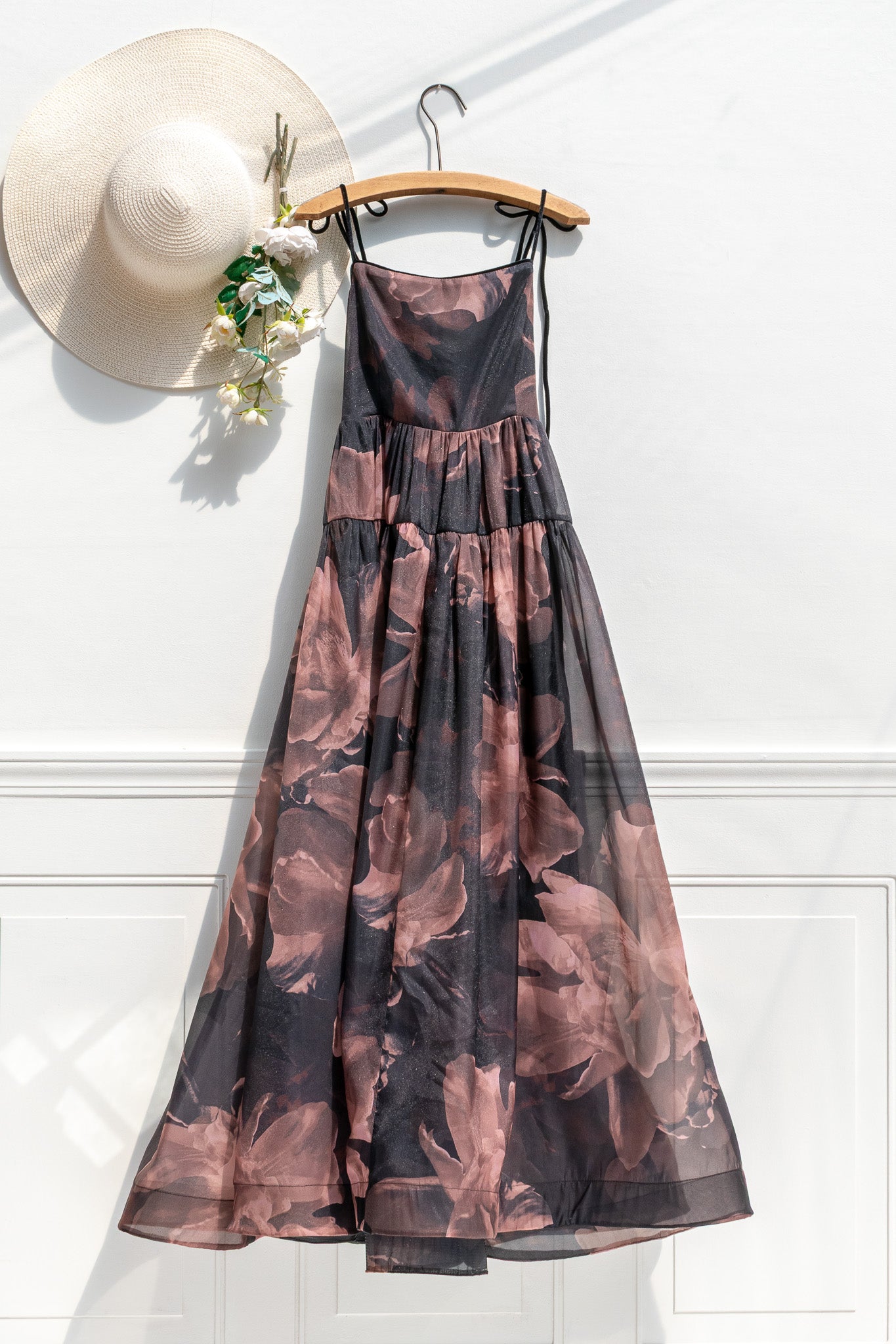A little theatre for autumn nights. The Delaney drapes in abstract-floral organza that seems to float with every step. Velvet piping traces the neckline and bodice, while tie shoulders let you adjust the fit and add a bow-tied finish. A sheer skirt glides over a soft lining, and a hidden horsehair hem lends graceful structure so the silhouette keeps its sweep. From gallery openings to holiday fêtes, Delaney brings romance—and movement—to the room.