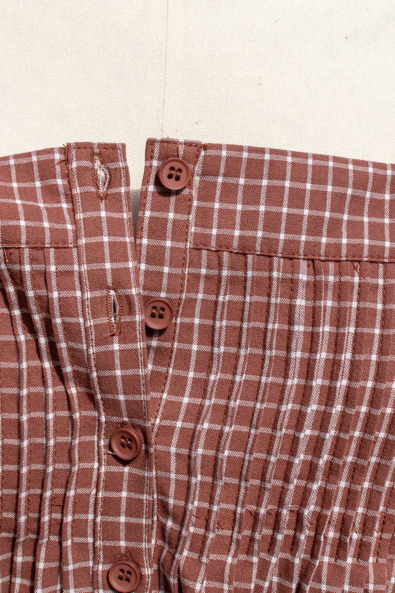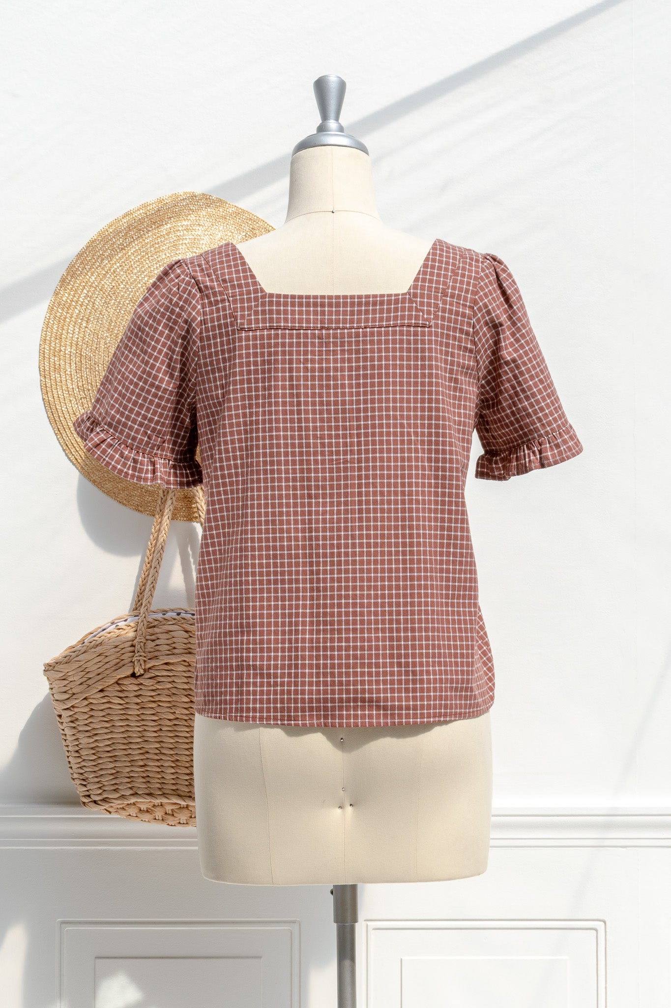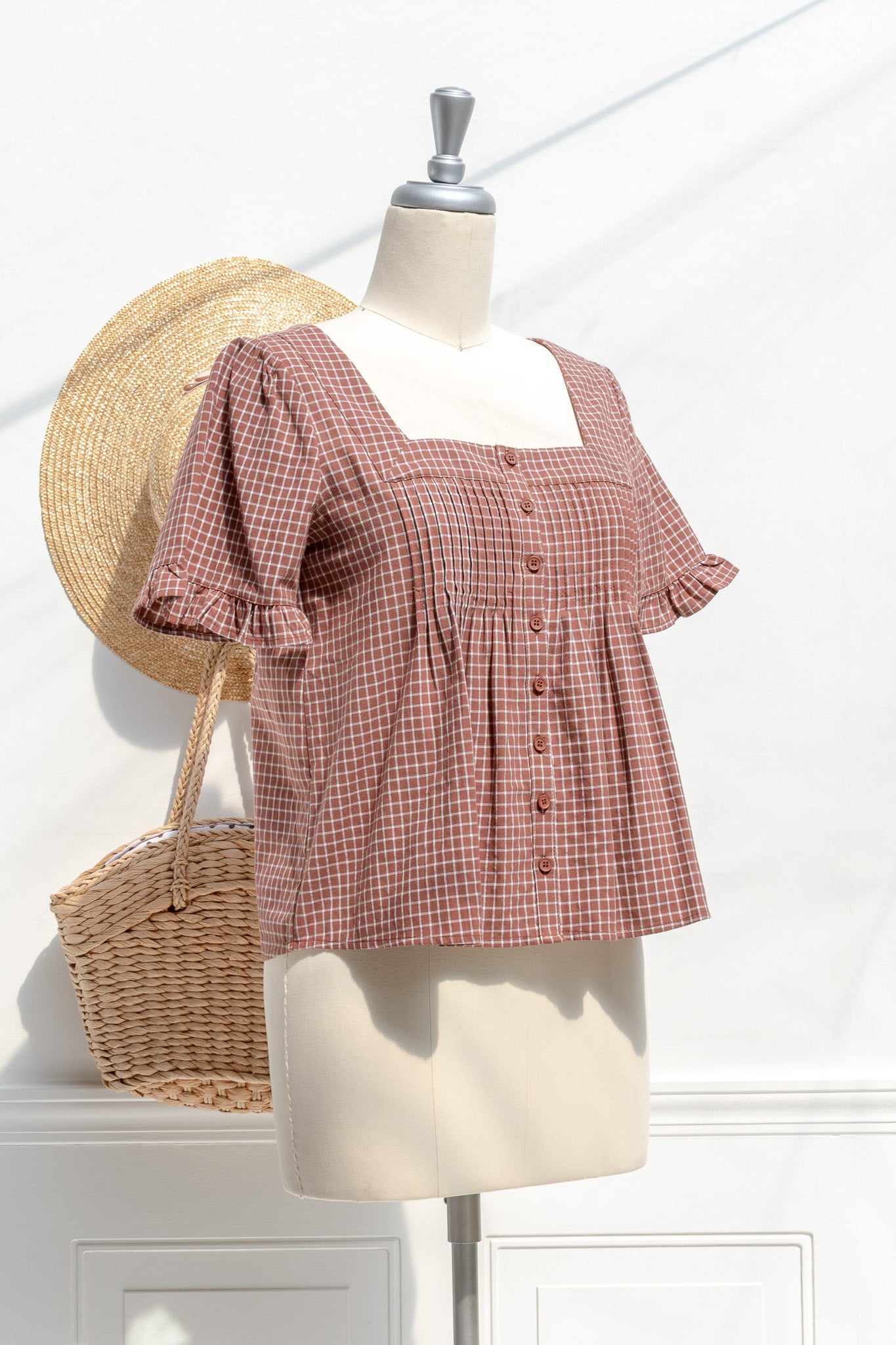 A little romance for every day. The Mavis Cotton Babydoll blouse in burnt umber cotton pairs a clean square neckline with fluttery ruffled short sleeves, neat pintucks, and a relaxed babydoll fit that skims instead of clings. The button-front makes it easy to style—tuck into a skirt for French-girl polish or wear loose with denim for soft, autumnal ease.